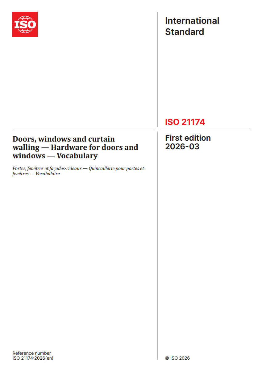 作为 ISO/TC 162 自 1975 年成立以来发布的首部建筑五金领域基础国际标准,ISO 21174:2026 的发布填补了门窗五金专业术语国际标准的空白,与已发布的ISO 22496:2021(门窗术语)、ISO 22497:2021(幕墙术语)共同形成完整的建筑门窗幕墙领域术语标准体系,为全球行业提供权威、统一的标准化术语库。
