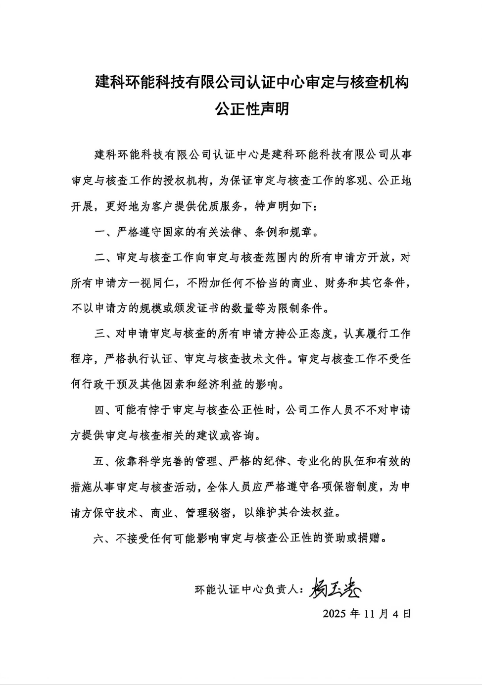 建科环能科技有限公司审定与核查业务公正性声明