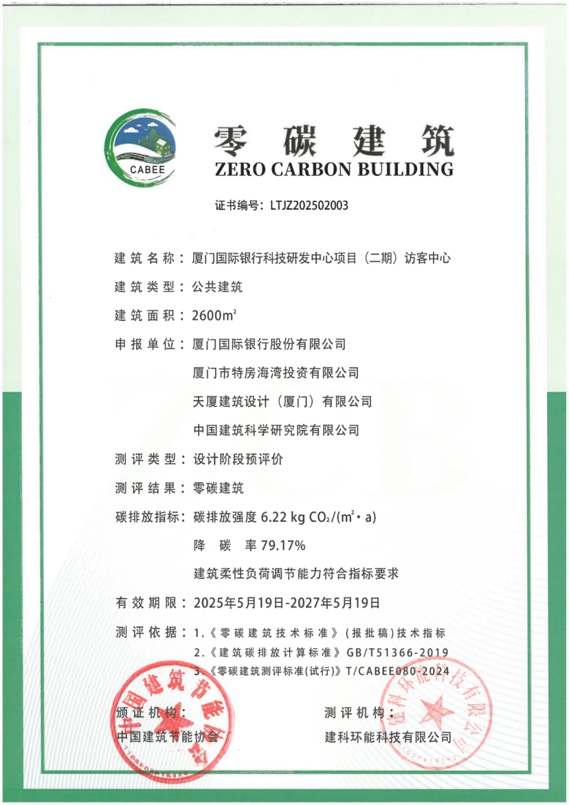 由中国建研院环能院提供零碳建筑全过程技术咨询服务的厦门国际银行科技研发中心项目(二期)访客中心,于2025年5月通过专家组评审和中国建筑节能协会复核及公示,正式获得中国建筑节能协会零碳建筑设计标识,成为福建省首个依据国家标准体系认证的零碳建筑。